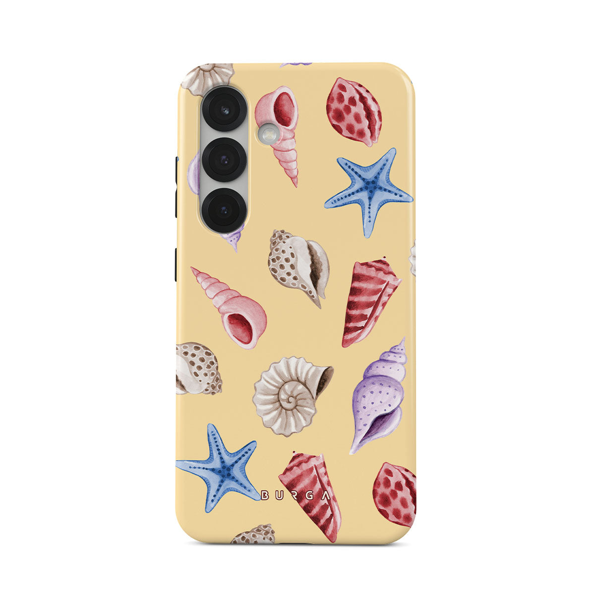 Kenmerken van dit design: schelpen, zeesterren, pastelgele achtergrond, oceaanthema.