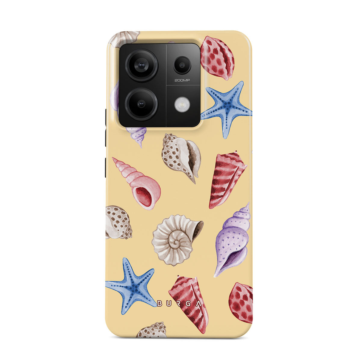 Kenmerken van dit design: schelpen, zeesterren, pastelgele achtergrond, oceaanthema.