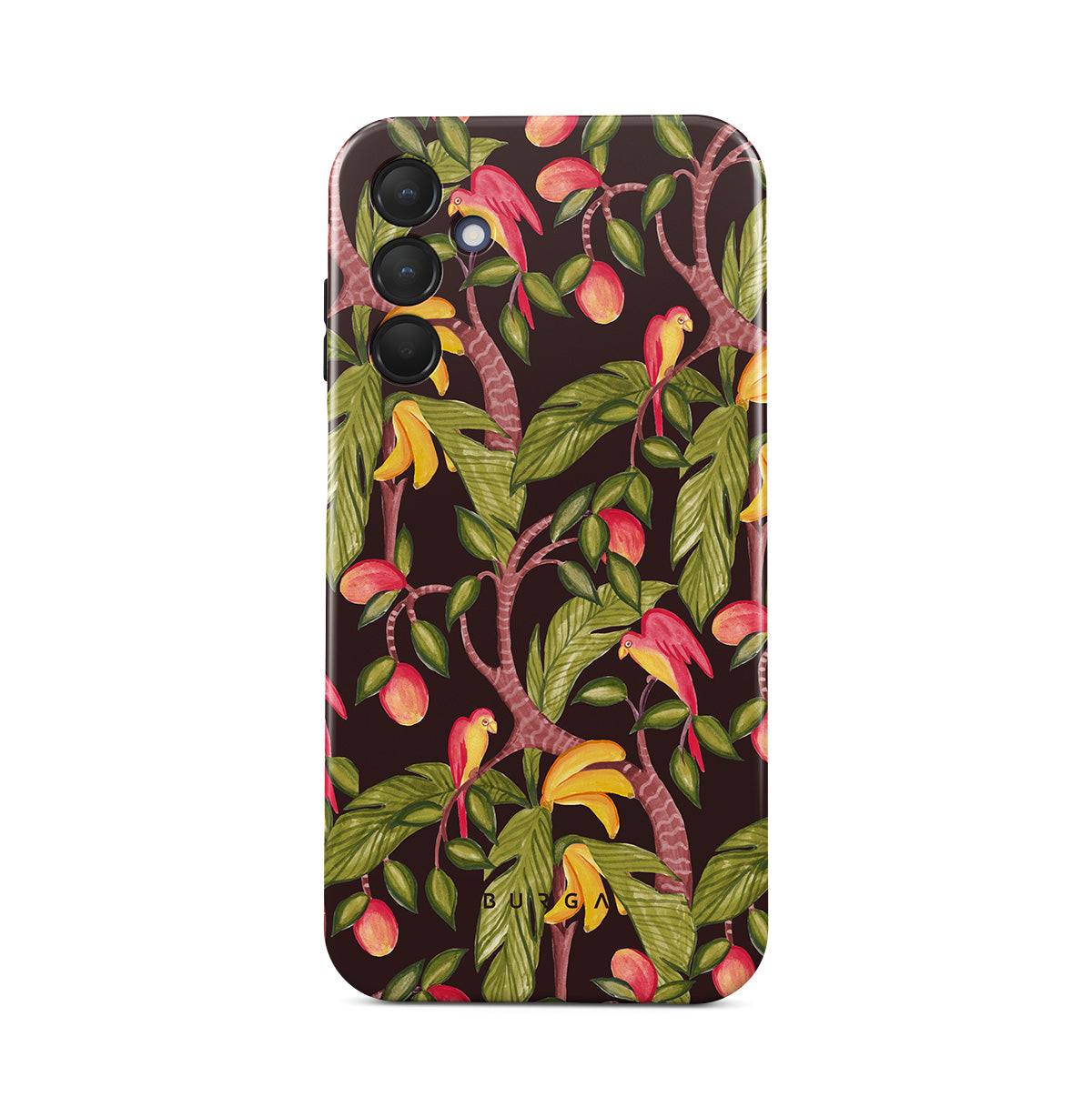 Kenmerken van dit design: mango's, donkere groene bladeren, jungle geïnspireerd patroon