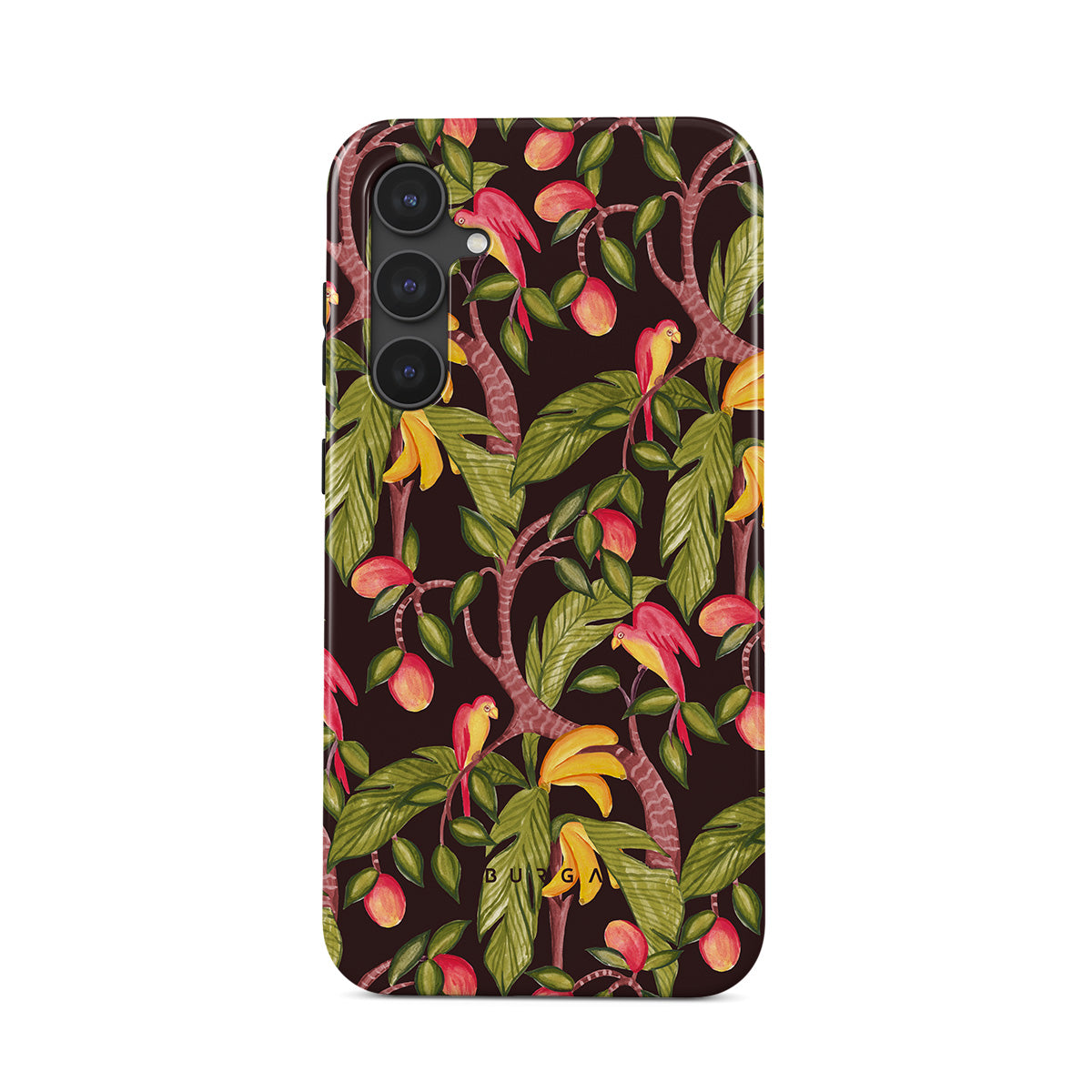 Kenmerken van dit design: mango's, donkere groene bladeren, jungle geïnspireerd patroon