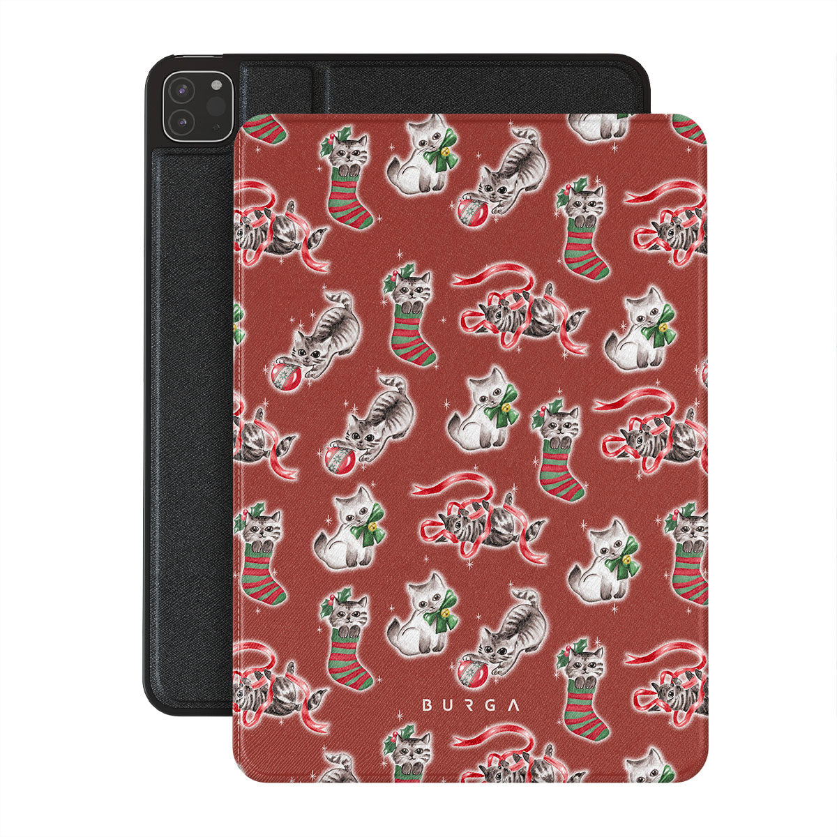 Kenmerken van dit design: katten, kerstkousen, kittens, rood en groen patroon, speelse katten, kerstversieringen
