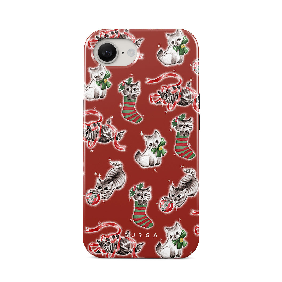 Kenmerken van dit design: katten, kerstkousen, kittens, rood en groen patroon, speelse katten, kerstversieringen