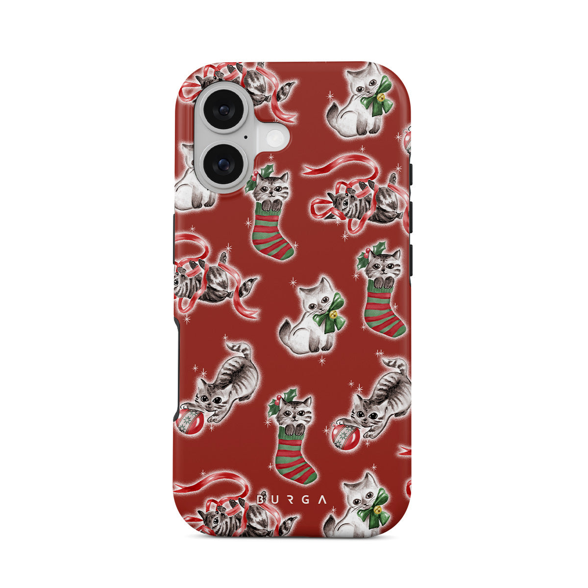 Kenmerken van dit design: katten, kerstkousen, kittens, rood en groen patroon, speelse katten, kerstversieringen