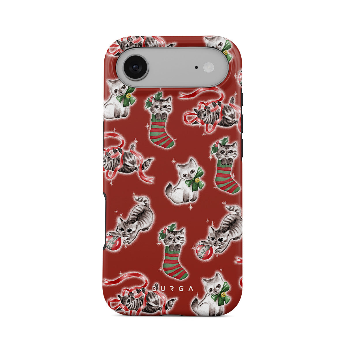Kenmerken van dit design: katten, kerstkousen, kittens, rood en groen patroon, speelse katten, kerstversieringen
