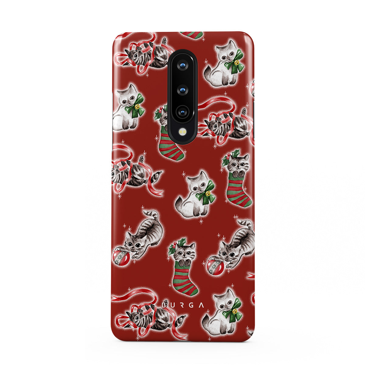 Kenmerken van dit design: katten, kerstkousen, kittens, rood en groen patroon, speelse katten, kerstversieringen