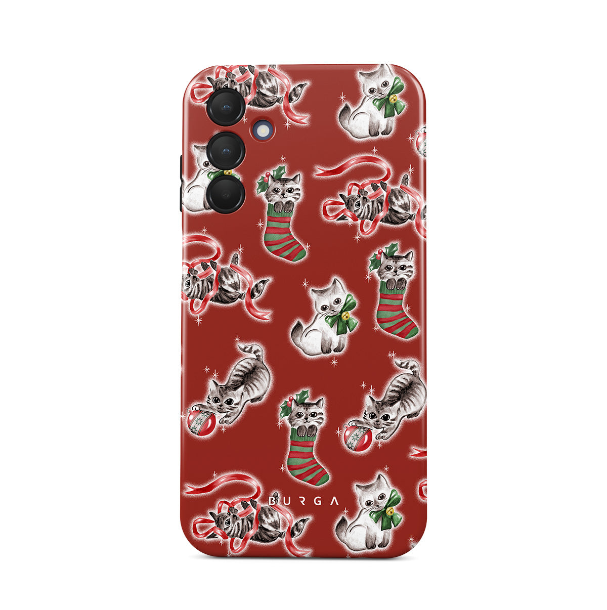 Kenmerken van dit design: katten, kerstkousen, kittens, rood en groen patroon, speelse katten, kerstversieringen