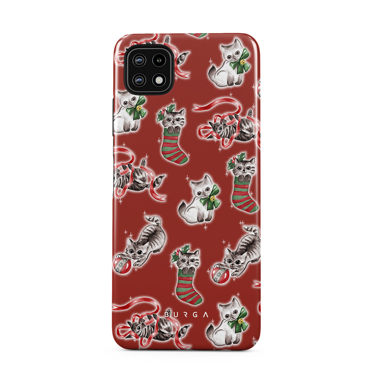 Kenmerken van dit design: katten, kerstkousen, kittens, rood en groen patroon, speelse katten, kerstversieringen