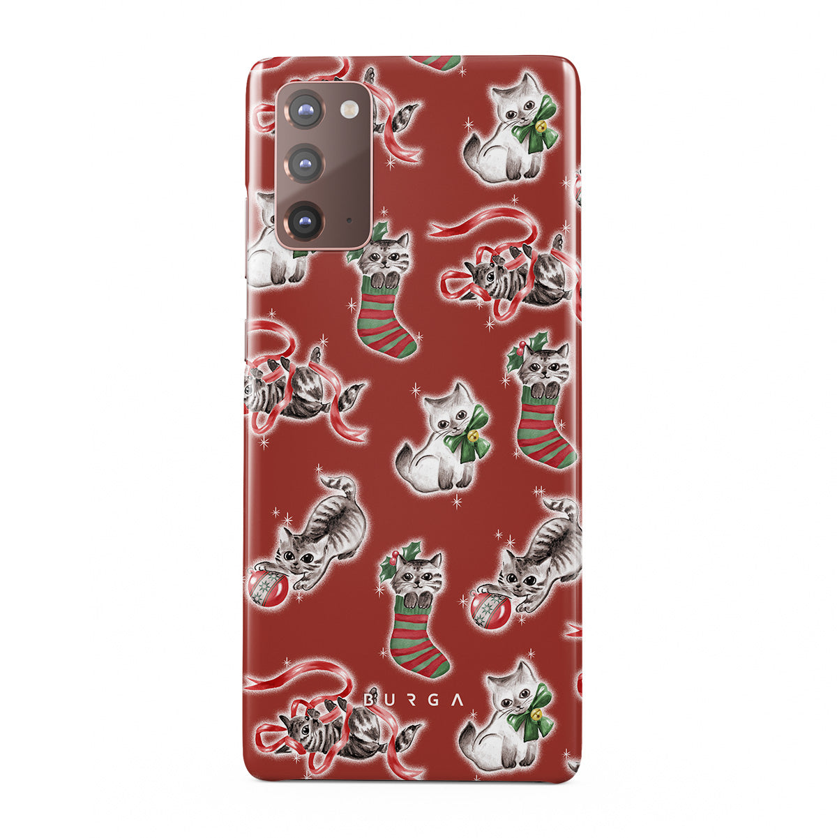 Kenmerken van dit design: katten, kerstkousen, kittens, rood en groen patroon, speelse katten, kerstversieringen