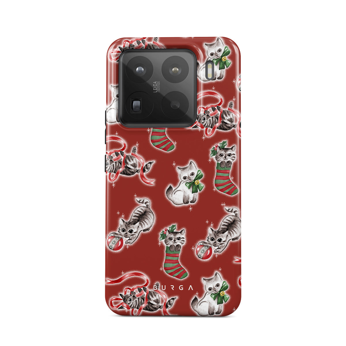 Kenmerken van dit design: katten, kerstkousen, kittens, rood en groen patroon, speelse katten, kerstversieringen