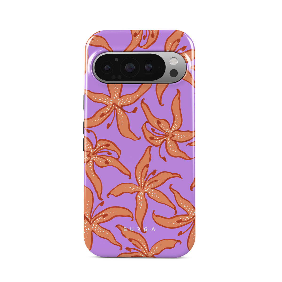 Kenmerken van dit design: oranje lelies, paarse achtergrond.