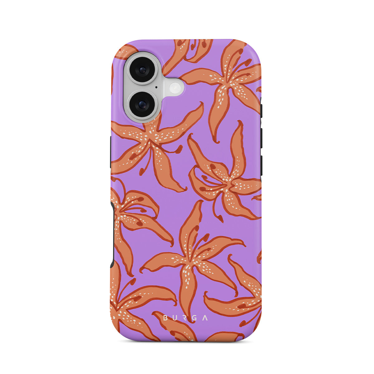 Kenmerken van dit design: oranje lelies, paarse achtergrond.