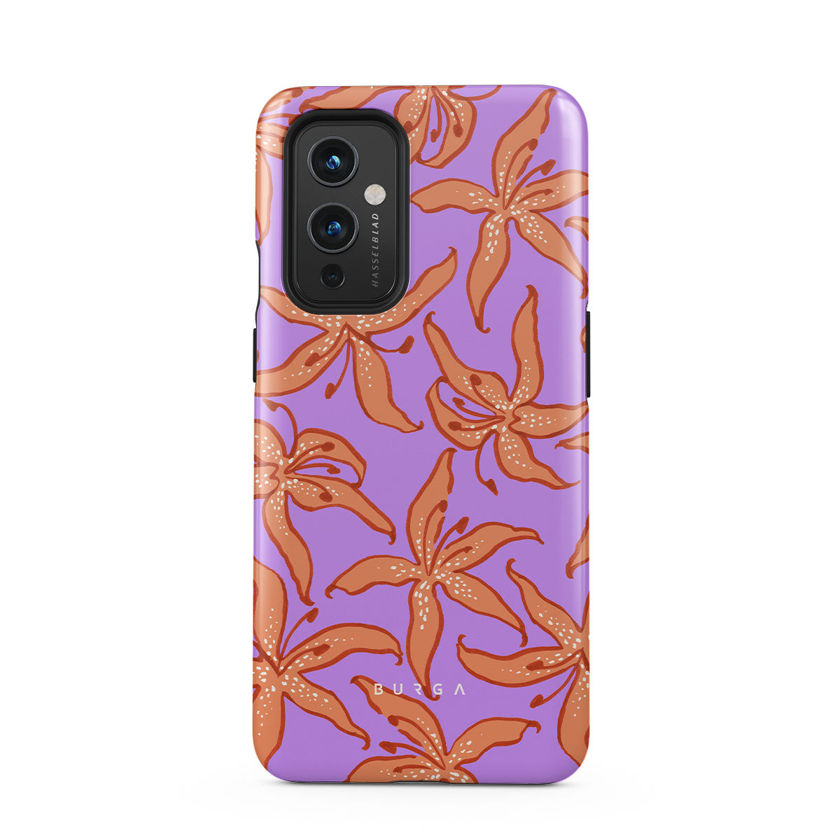 Kenmerken van dit design: oranje lelies, paarse achtergrond.