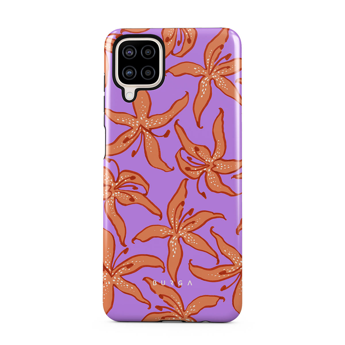 Kenmerken van dit design: oranje lelies, paarse achtergrond.