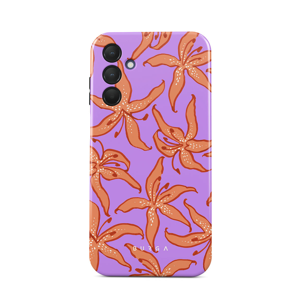 Kenmerken van dit design: oranje lelies, paarse achtergrond.