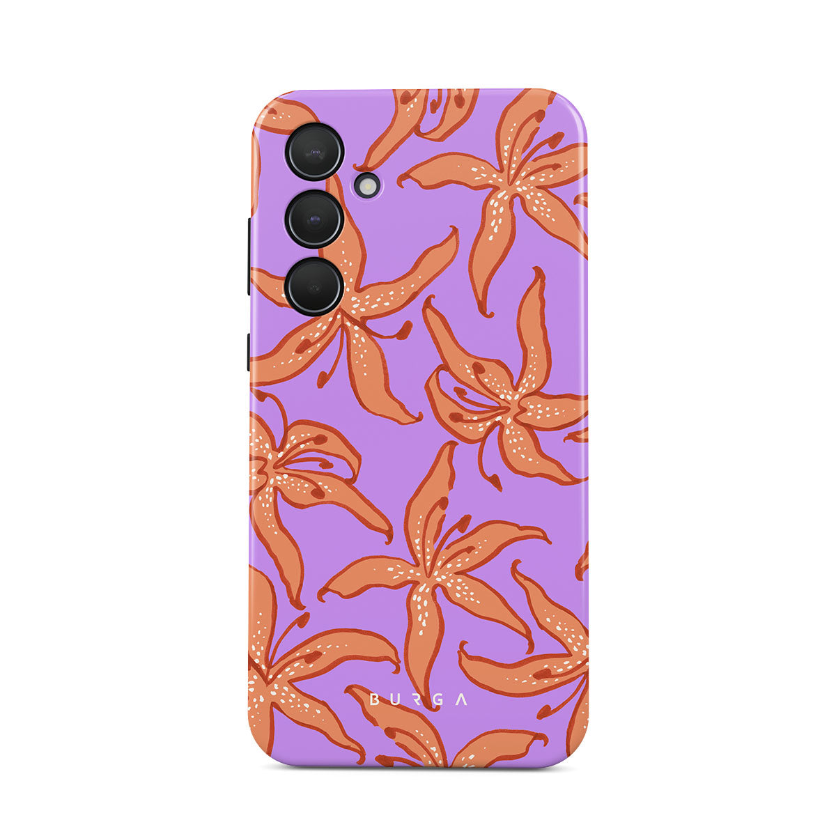 Kenmerken van dit design: oranje lelies, paarse achtergrond.