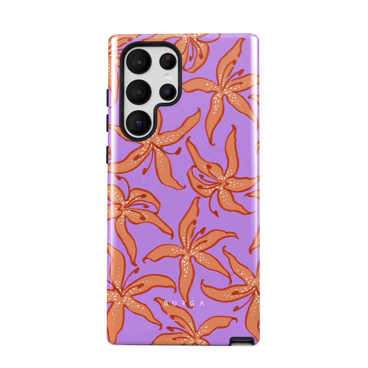Kenmerken van dit design: oranje lelies, paarse achtergrond.