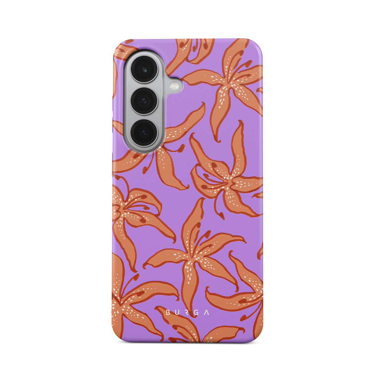 Kenmerken van dit design: oranje lelies, paarse achtergrond.