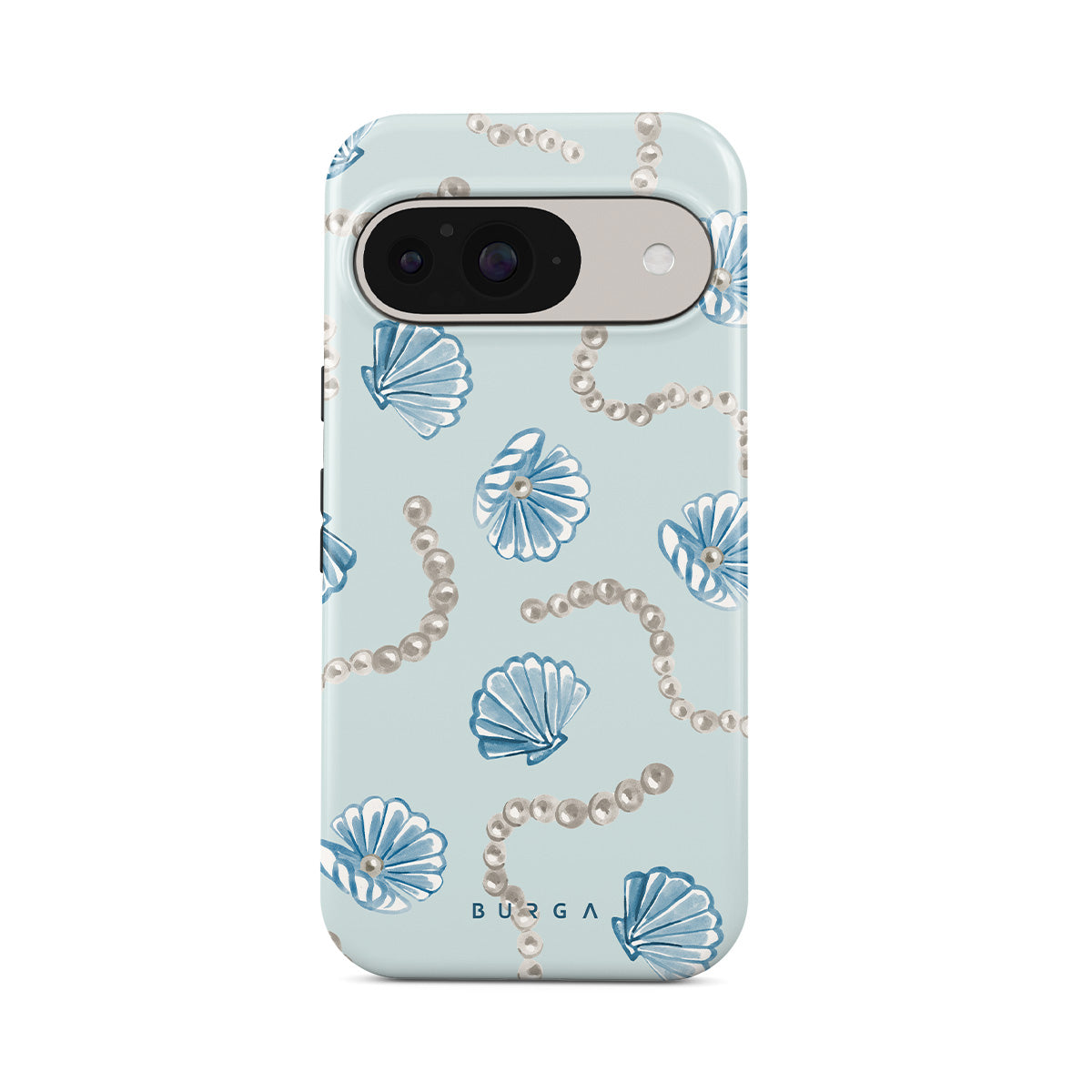 Kenmerken van dit design: parels, schelpen, lichtblauwe achtergrond, oceaan elementen.