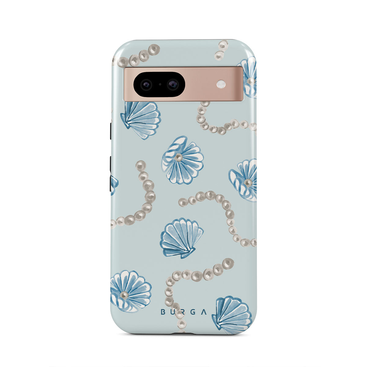 Kenmerken van dit design: parels, schelpen, lichtblauwe achtergrond, oceaan elementen.