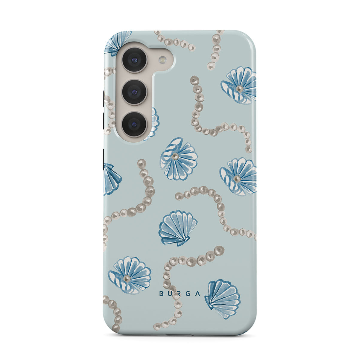 Kenmerken van dit design: parels, schelpen, lichtblauwe achtergrond, oceaan elementen.