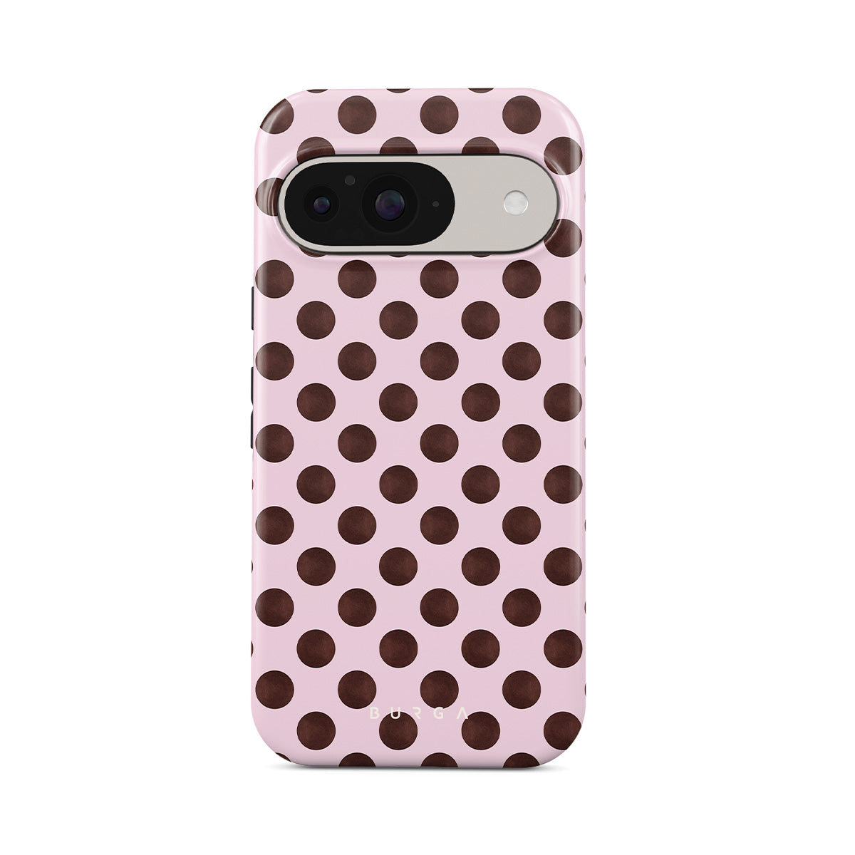 Kenmerken van dit design: een retro stippenpatroon, roze achtergrond met bruine stippen.