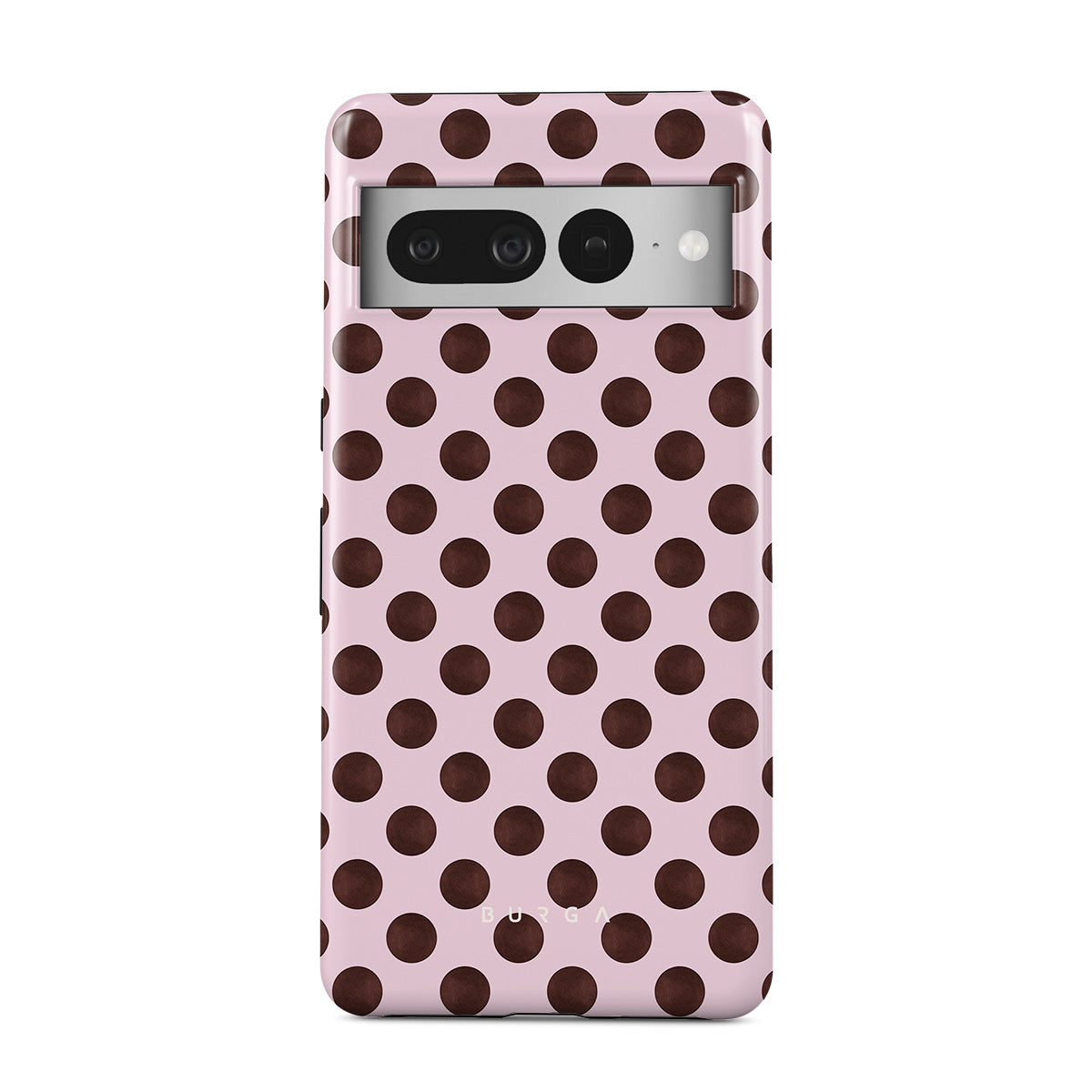 Kenmerken van dit design: een retro stippenpatroon, roze achtergrond met bruine stippen.