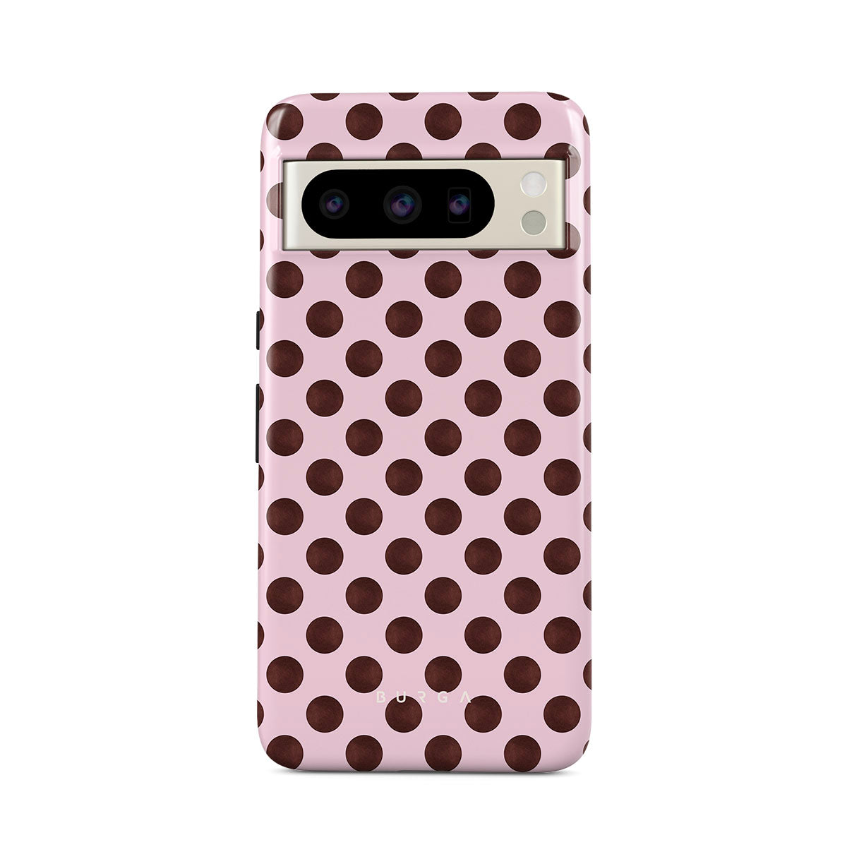 Kenmerken van dit design: een retro stippenpatroon, roze achtergrond met bruine stippen.