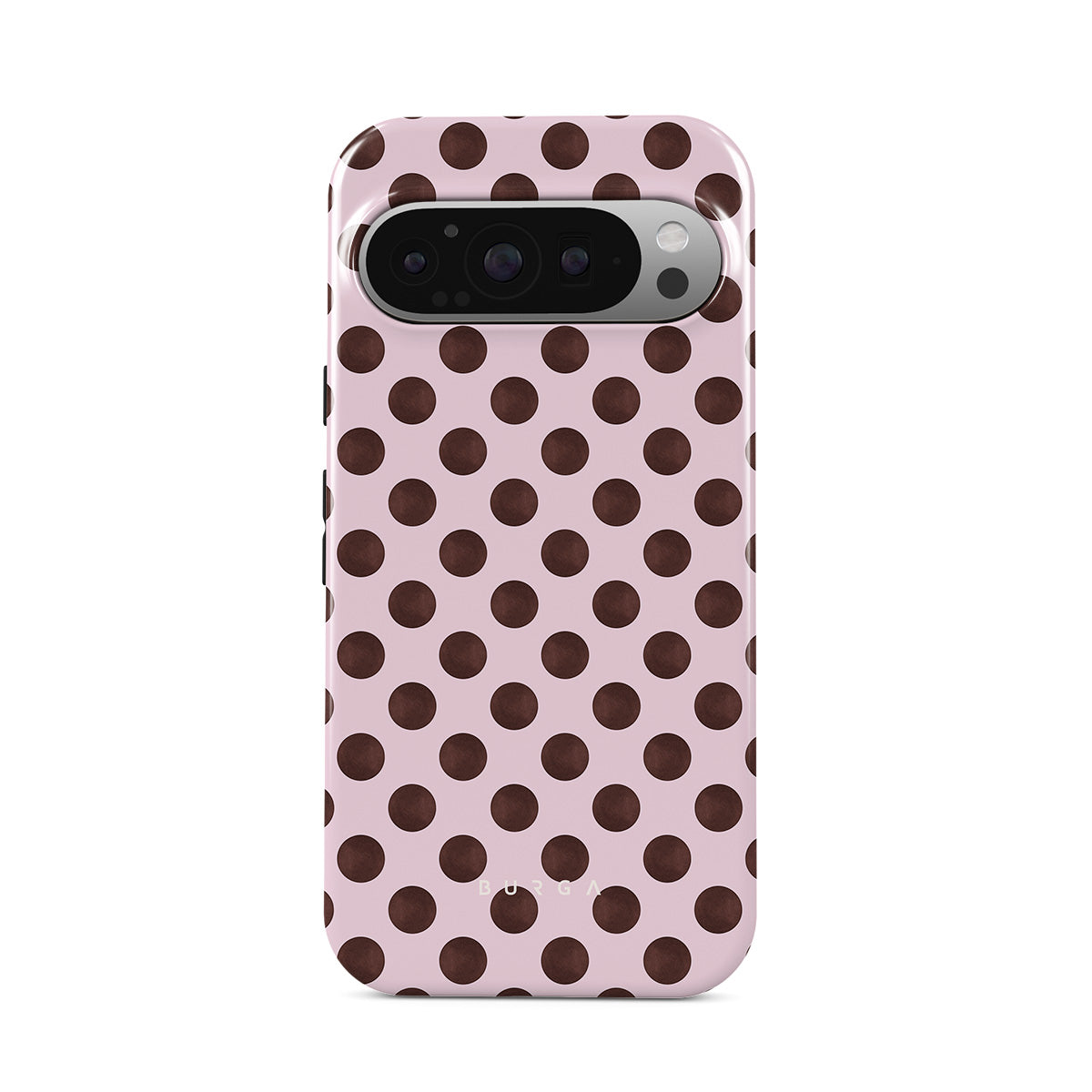 Kenmerken van dit design: een retro stippenpatroon, roze achtergrond met bruine stippen.