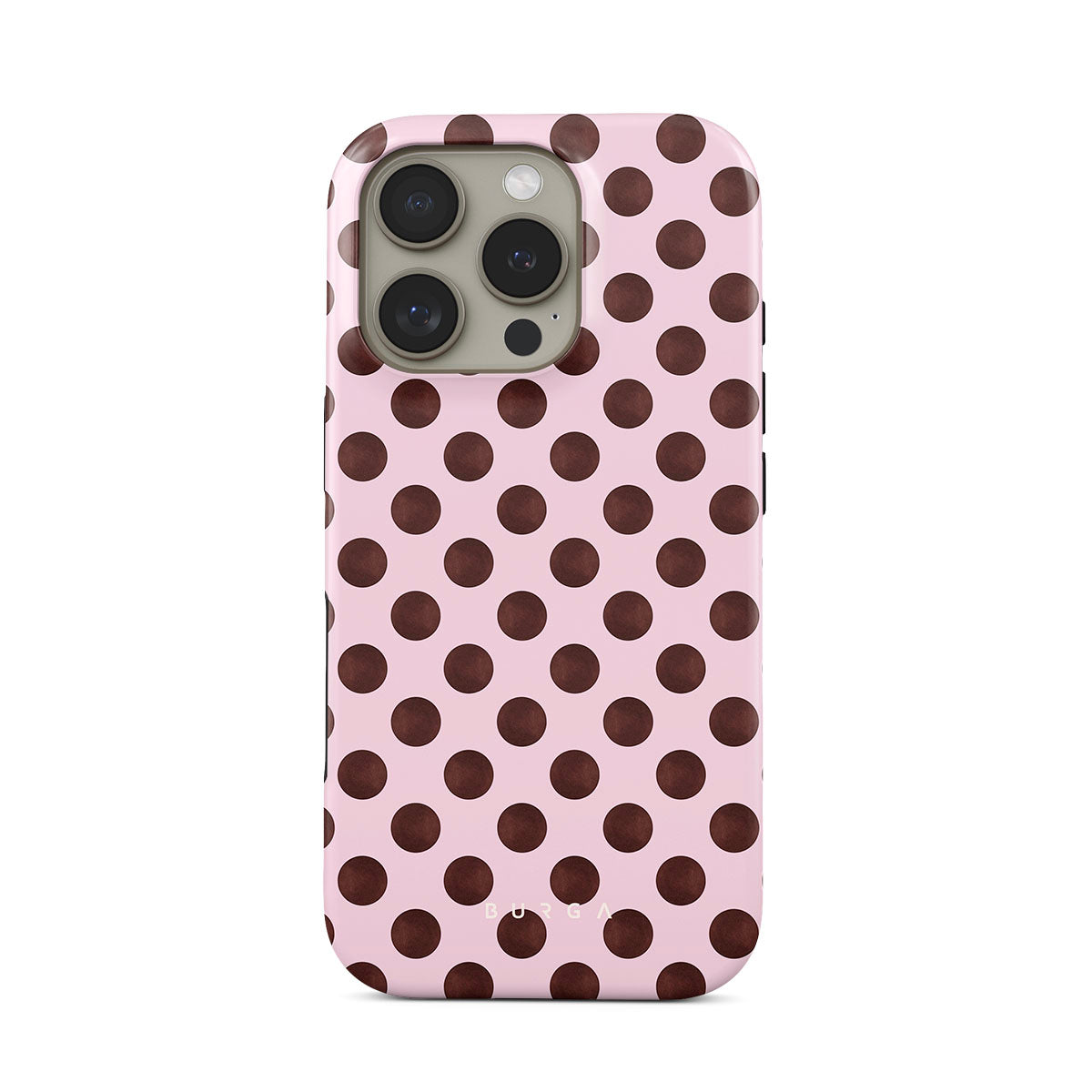 Kenmerken van dit design: een retro stippenpatroon, roze achtergrond met bruine stippen.