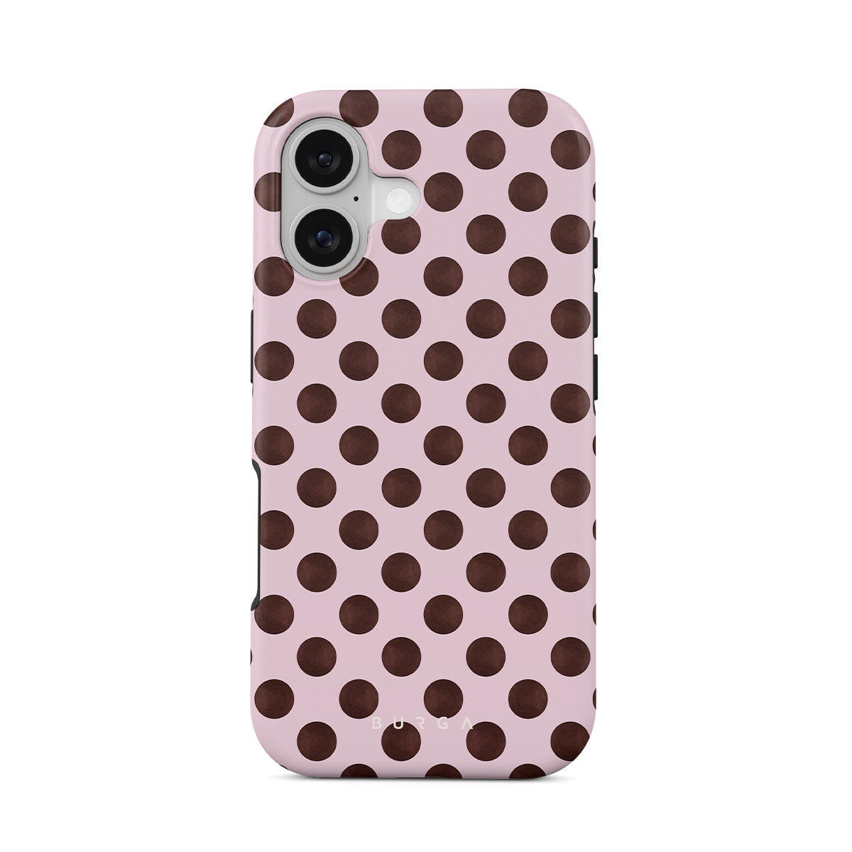 Kenmerken van dit design: een retro stippenpatroon, roze achtergrond met bruine stippen.