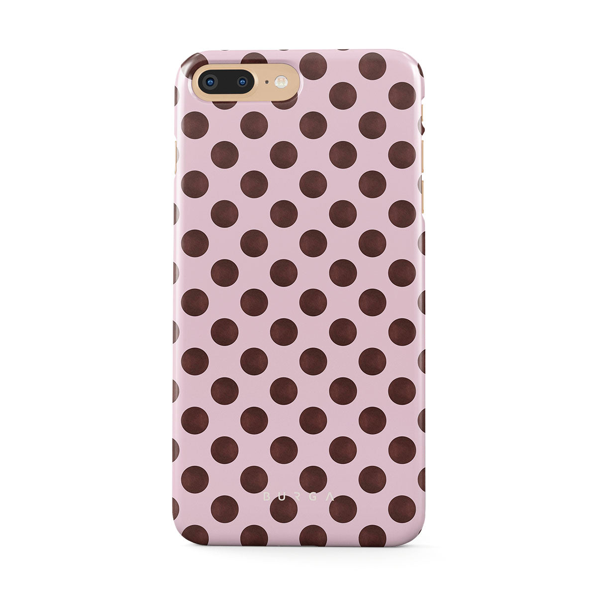 Kenmerken van dit design: een retro stippenpatroon, roze achtergrond met bruine stippen.