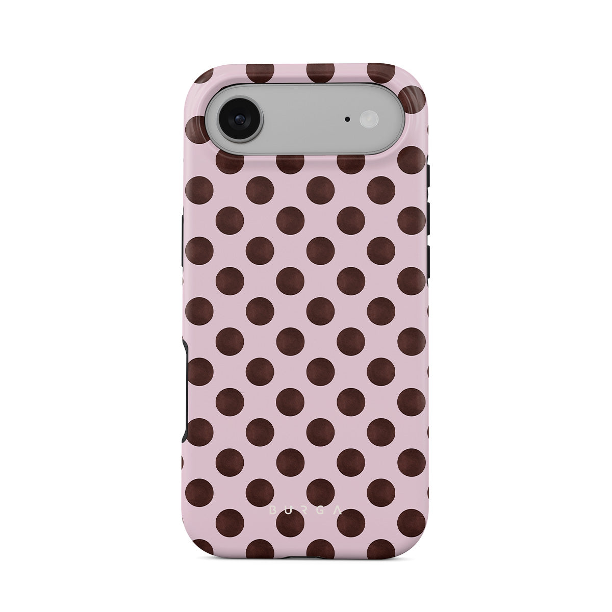 Kenmerken van dit design: een retro stippenpatroon, roze achtergrond met bruine stippen.