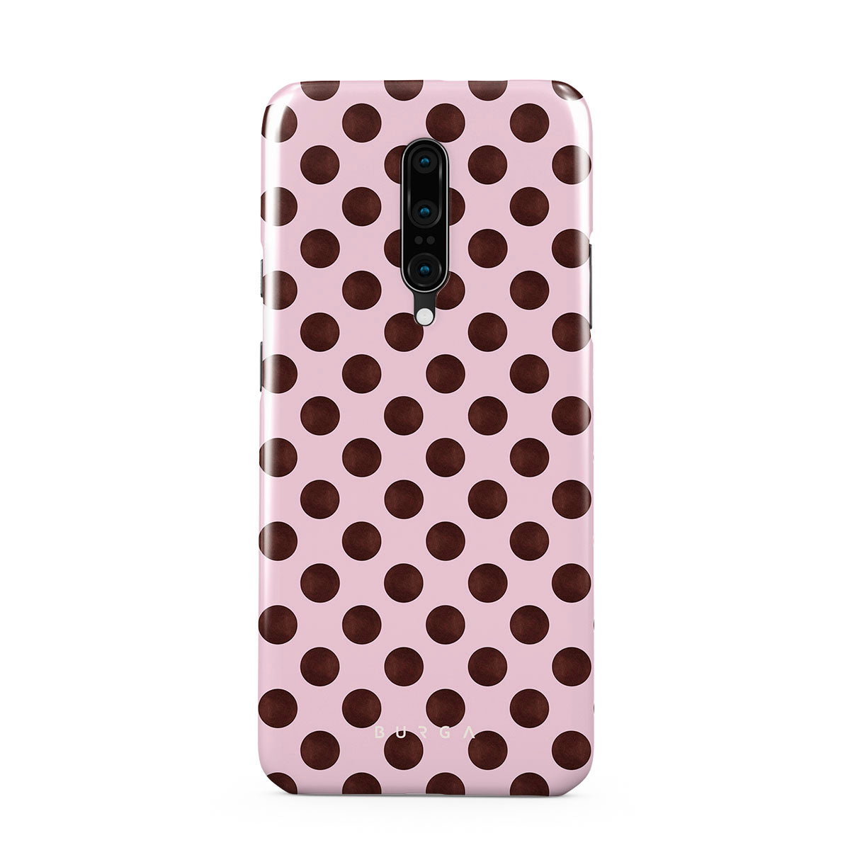 Kenmerken van dit design: een retro stippenpatroon, roze achtergrond met bruine stippen.
