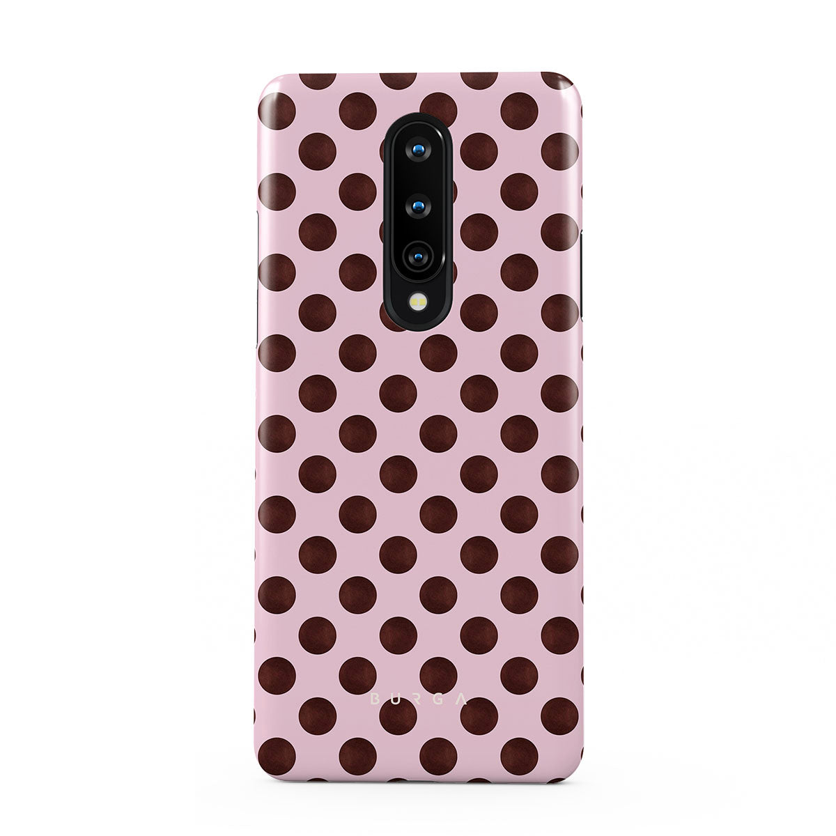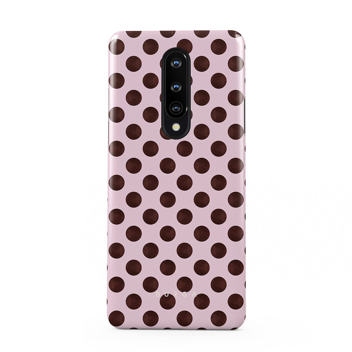 Kenmerken van dit design: een retro stippenpatroon, roze achtergrond met bruine stippen.