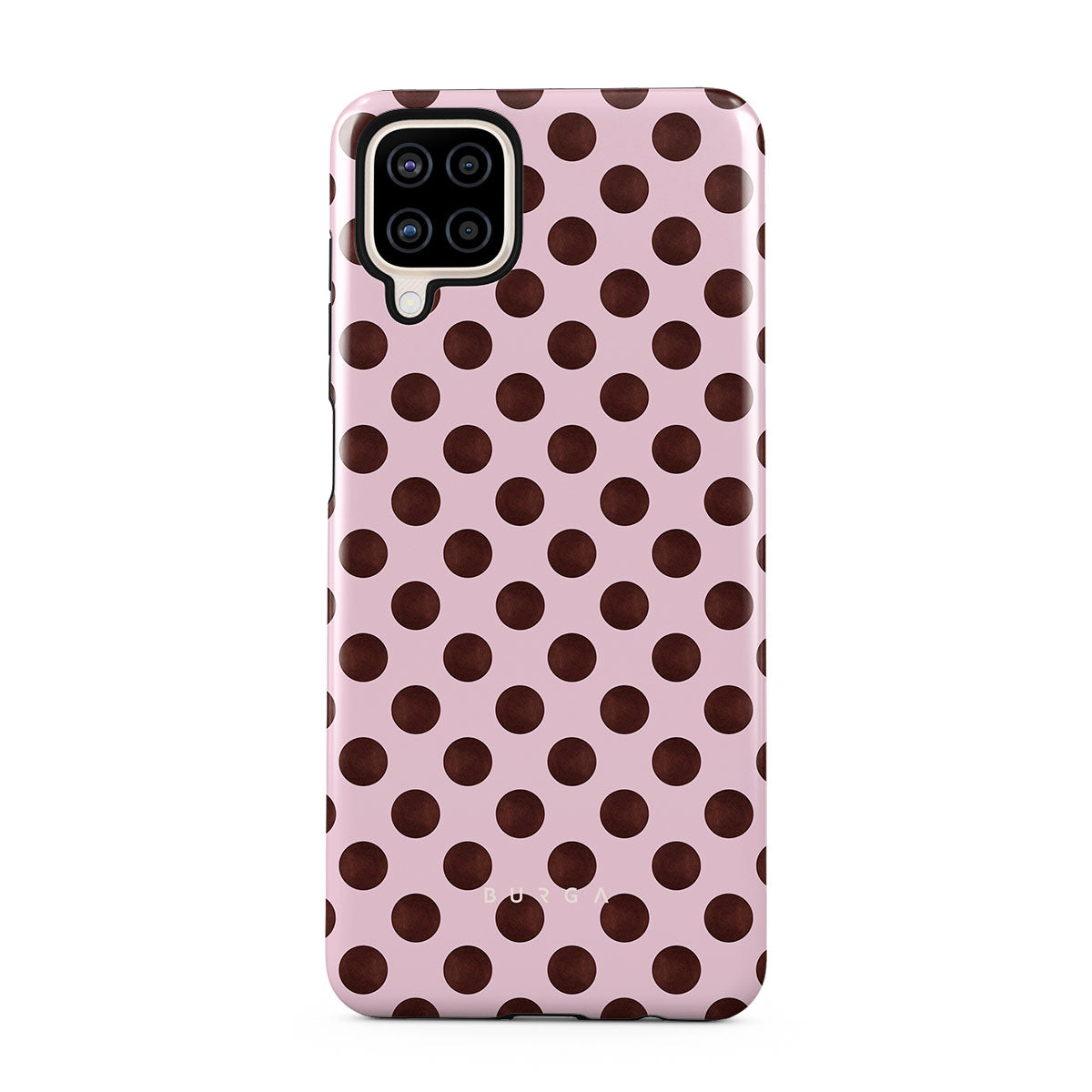 Kenmerken van dit design: een retro stippenpatroon, roze achtergrond met bruine stippen.