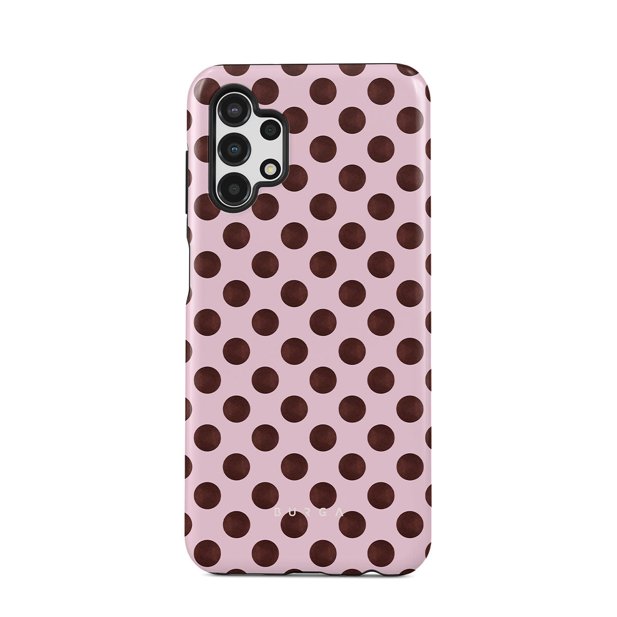 Kenmerken van dit design: een retro stippenpatroon, roze achtergrond met bruine stippen.
