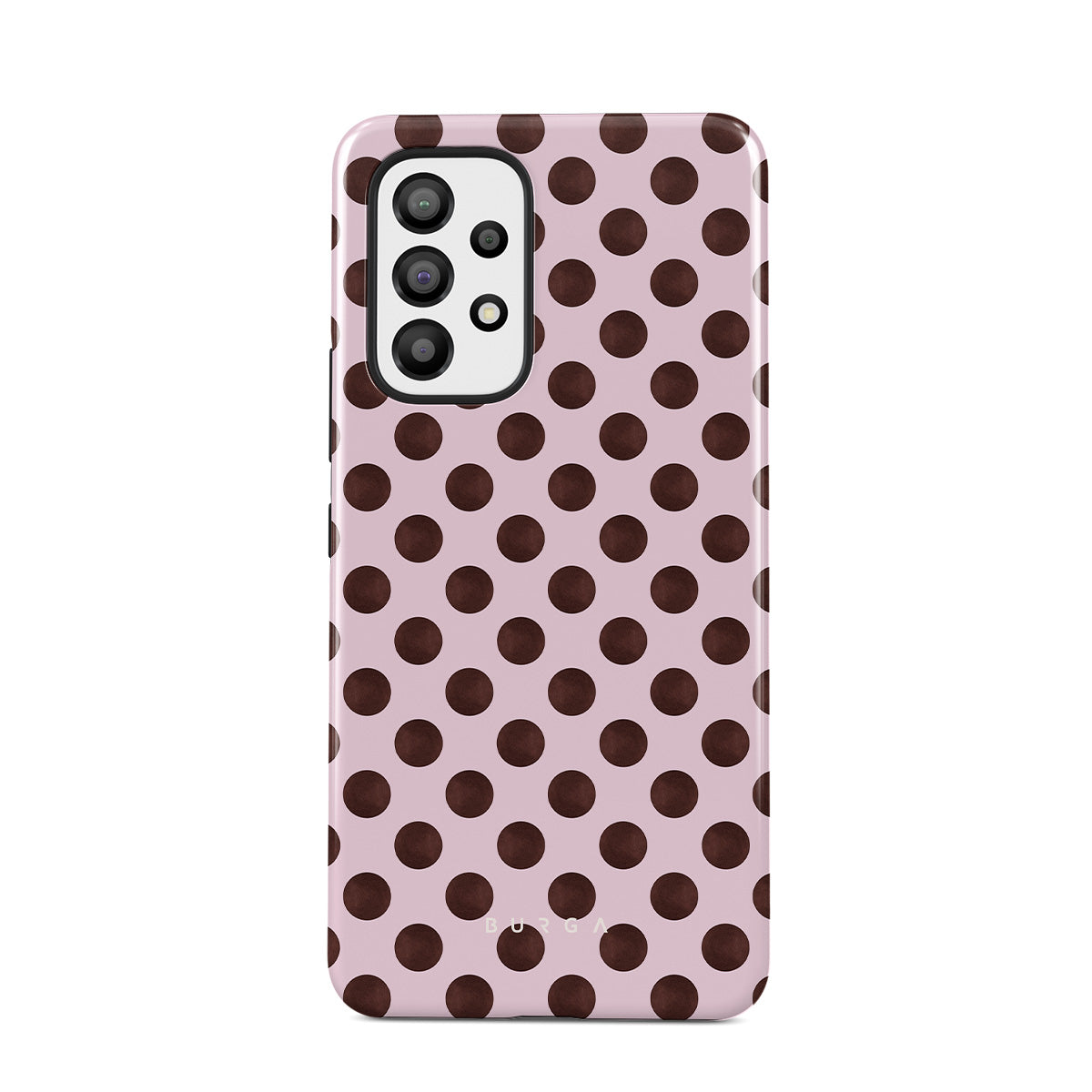 Kenmerken van dit design: een retro stippenpatroon, roze achtergrond met bruine stippen.