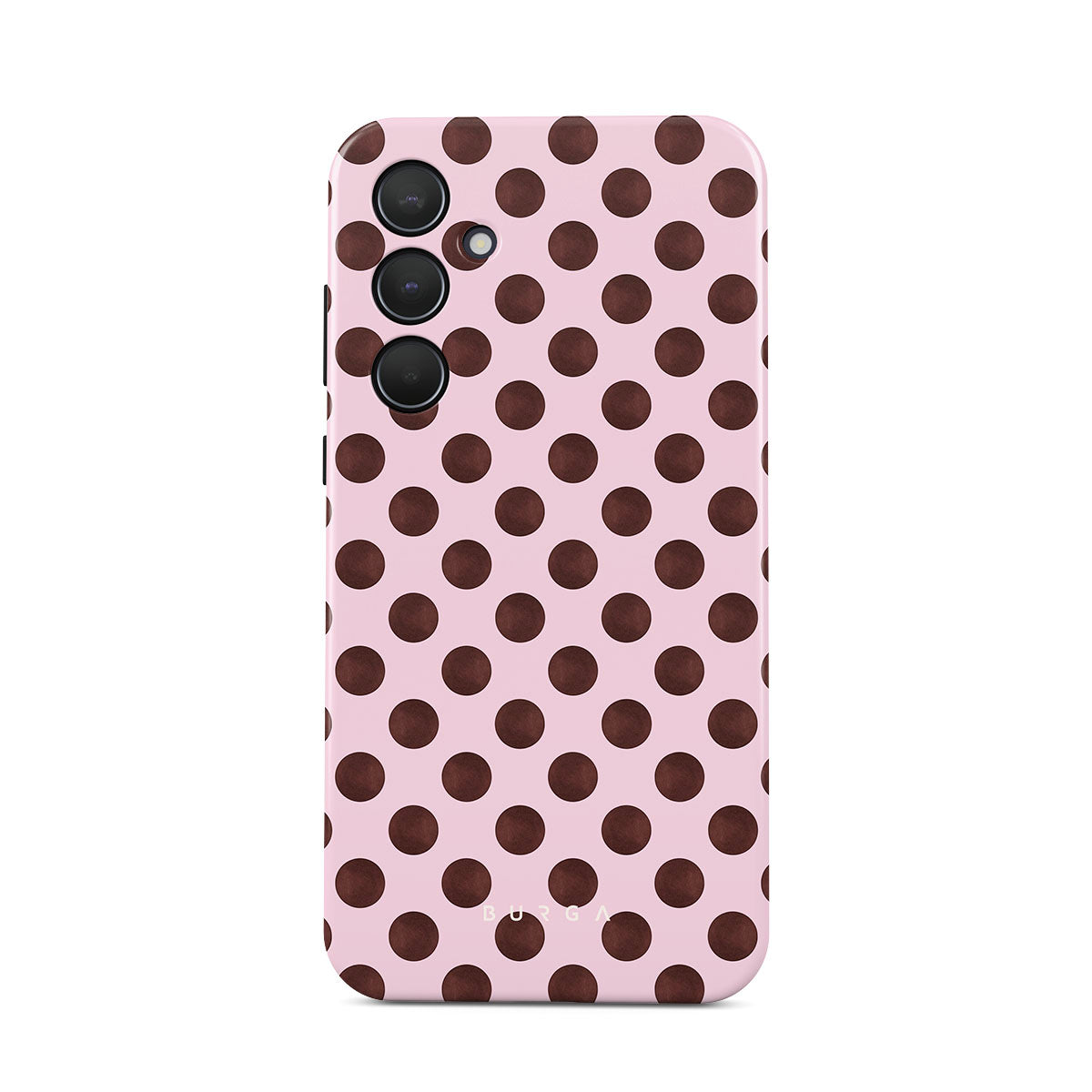 Kenmerken van dit design: een retro stippenpatroon, roze achtergrond met bruine stippen.