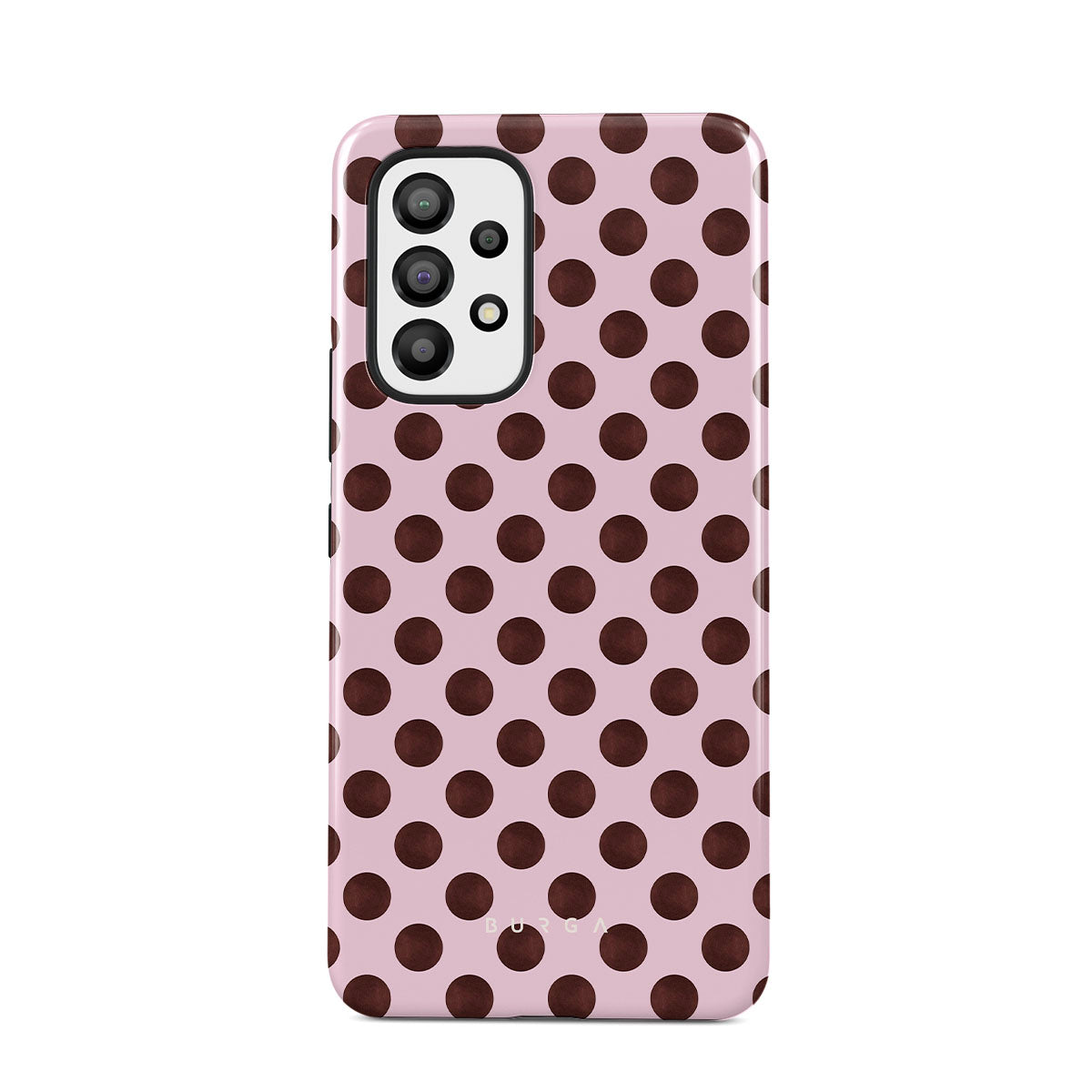Kenmerken van dit design: een retro stippenpatroon, roze achtergrond met bruine stippen.
