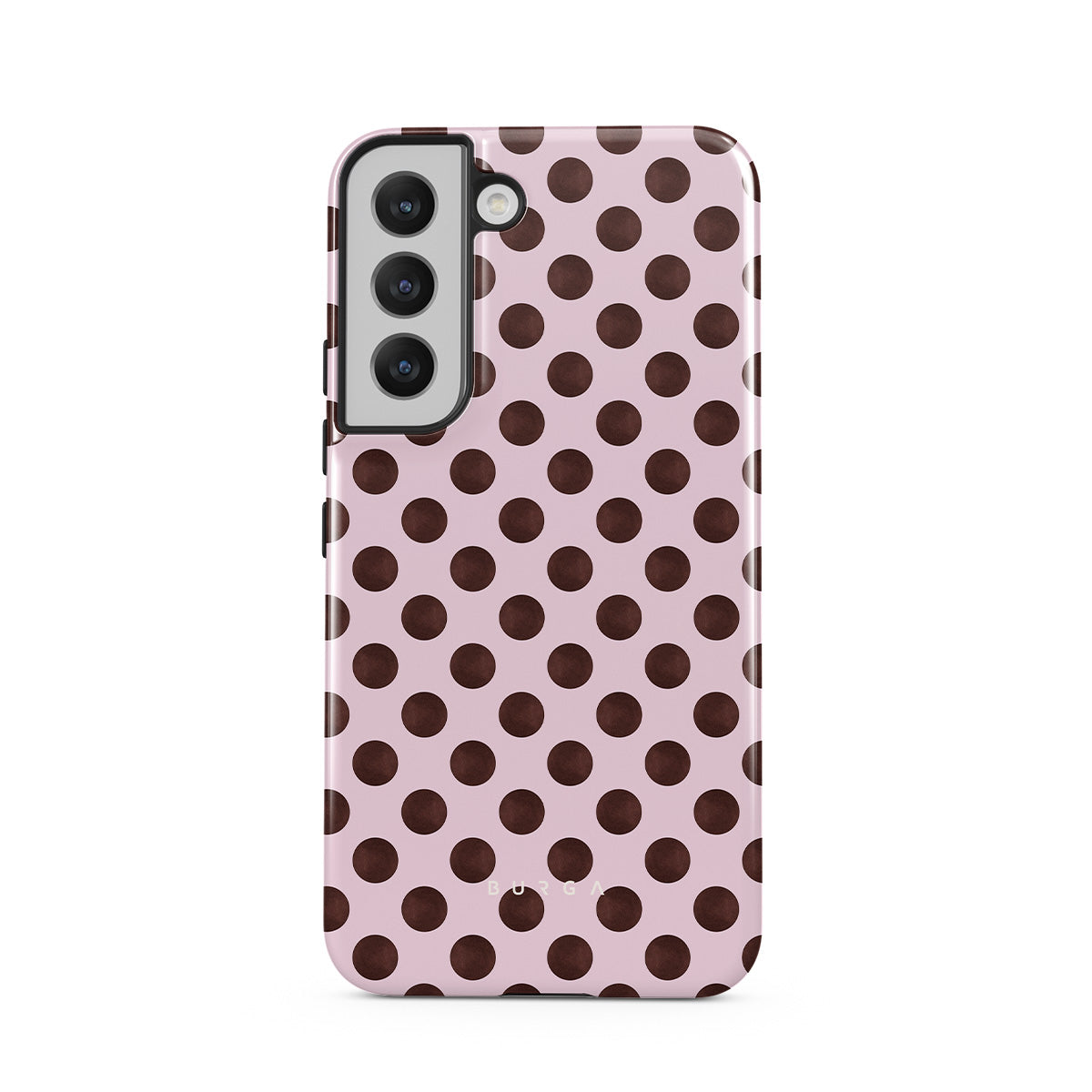 Kenmerken van dit design: een retro stippenpatroon, roze achtergrond met bruine stippen.
