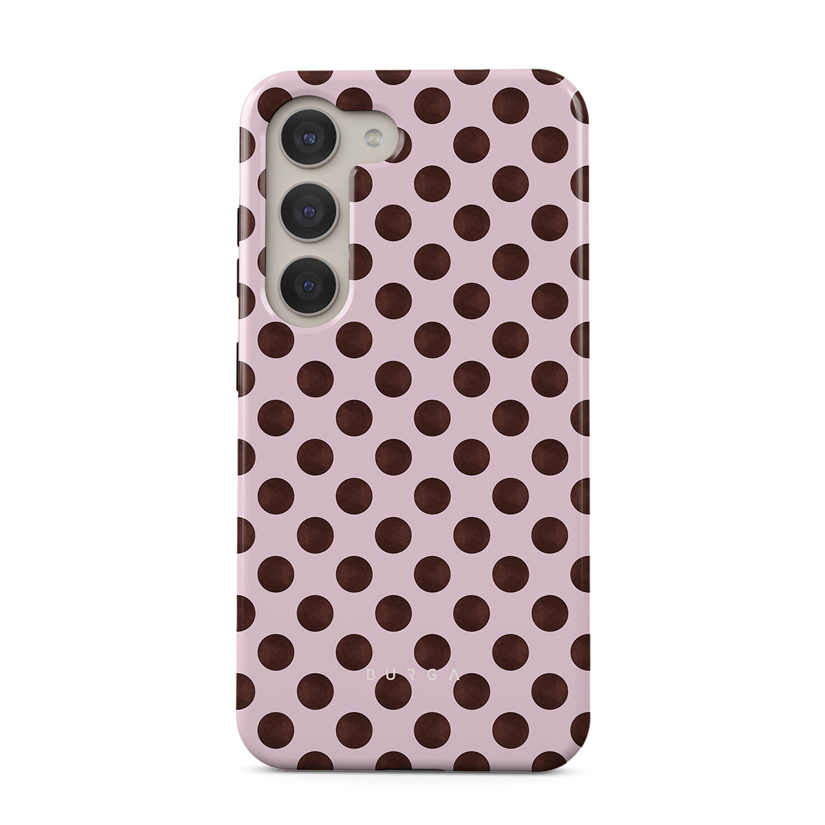 Kenmerken van dit design: een retro stippenpatroon, roze achtergrond met bruine stippen.