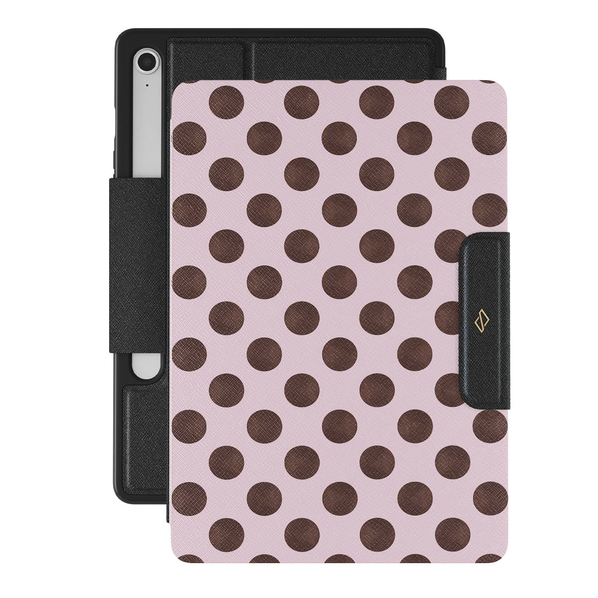 Kenmerken van dit design: een retro stippenpatroon, roze achtergrond met bruine stippen.