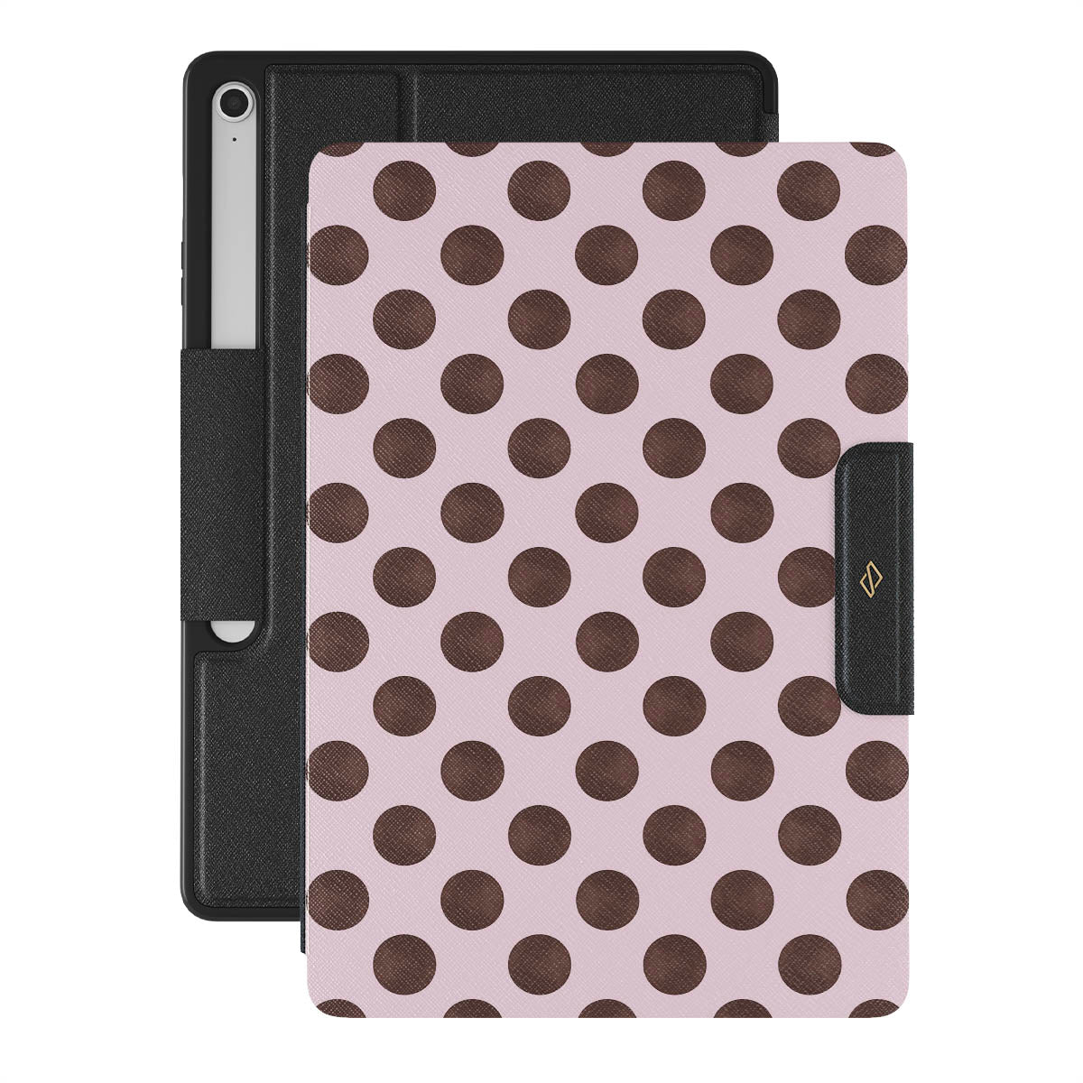 Kenmerken van dit design: een retro stippenpatroon, roze achtergrond met bruine stippen.