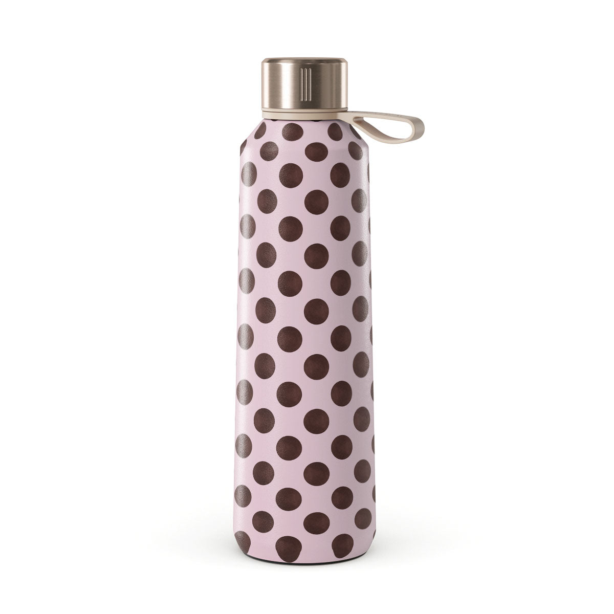 Kenmerken van dit design: een retro stippenpatroon, roze achtergrond met bruine stippen.