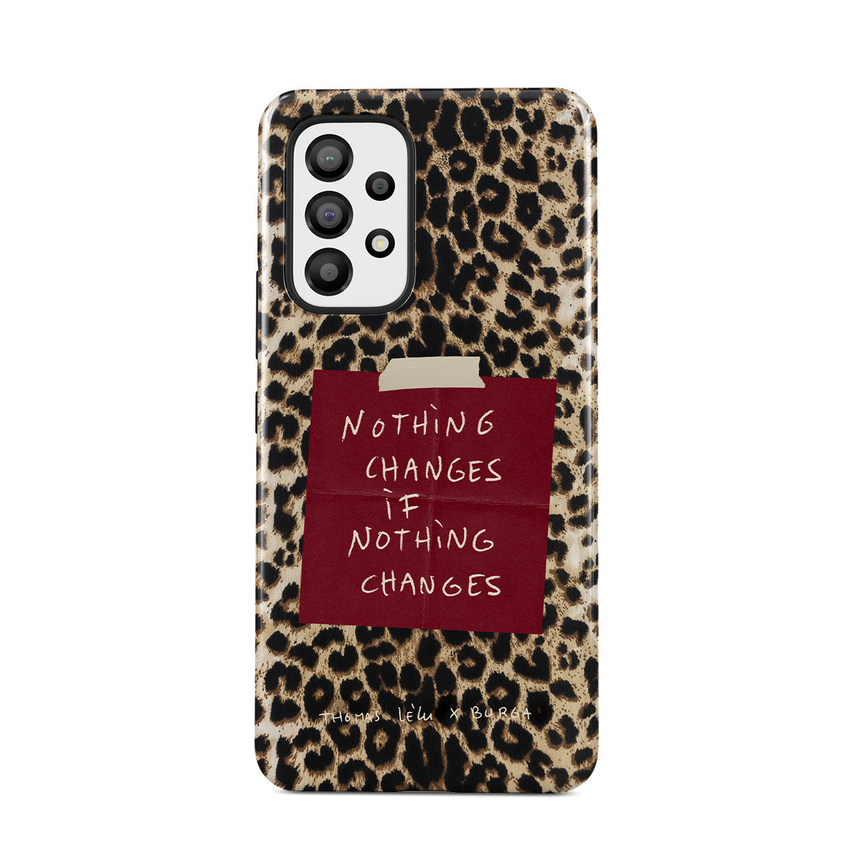 Kenmerken van dit design: cursieve tekst, citaat, rood memoblaadje, dierenprint