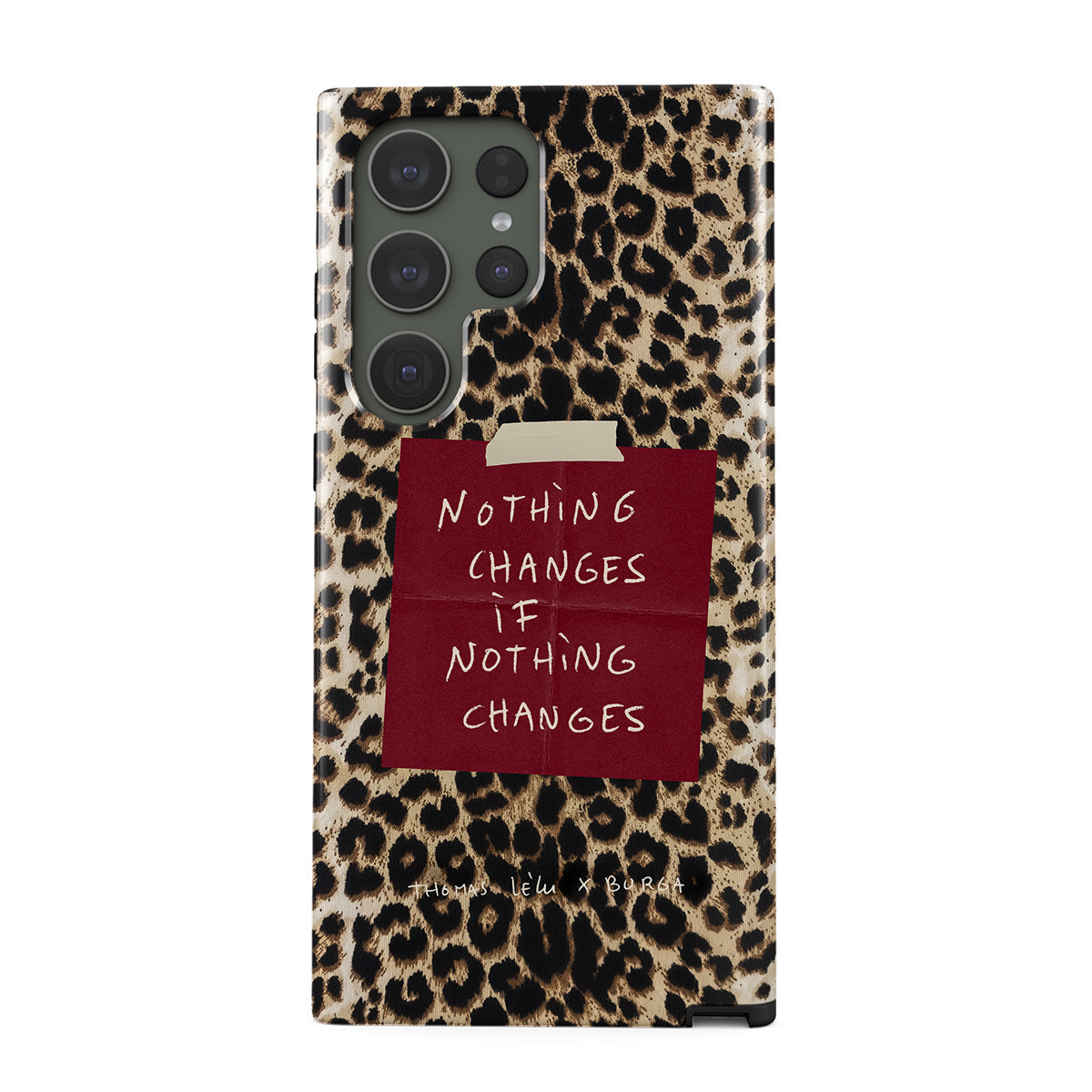 Kenmerken van dit design: cursieve tekst, citaat, rood memoblaadje, dierenprint