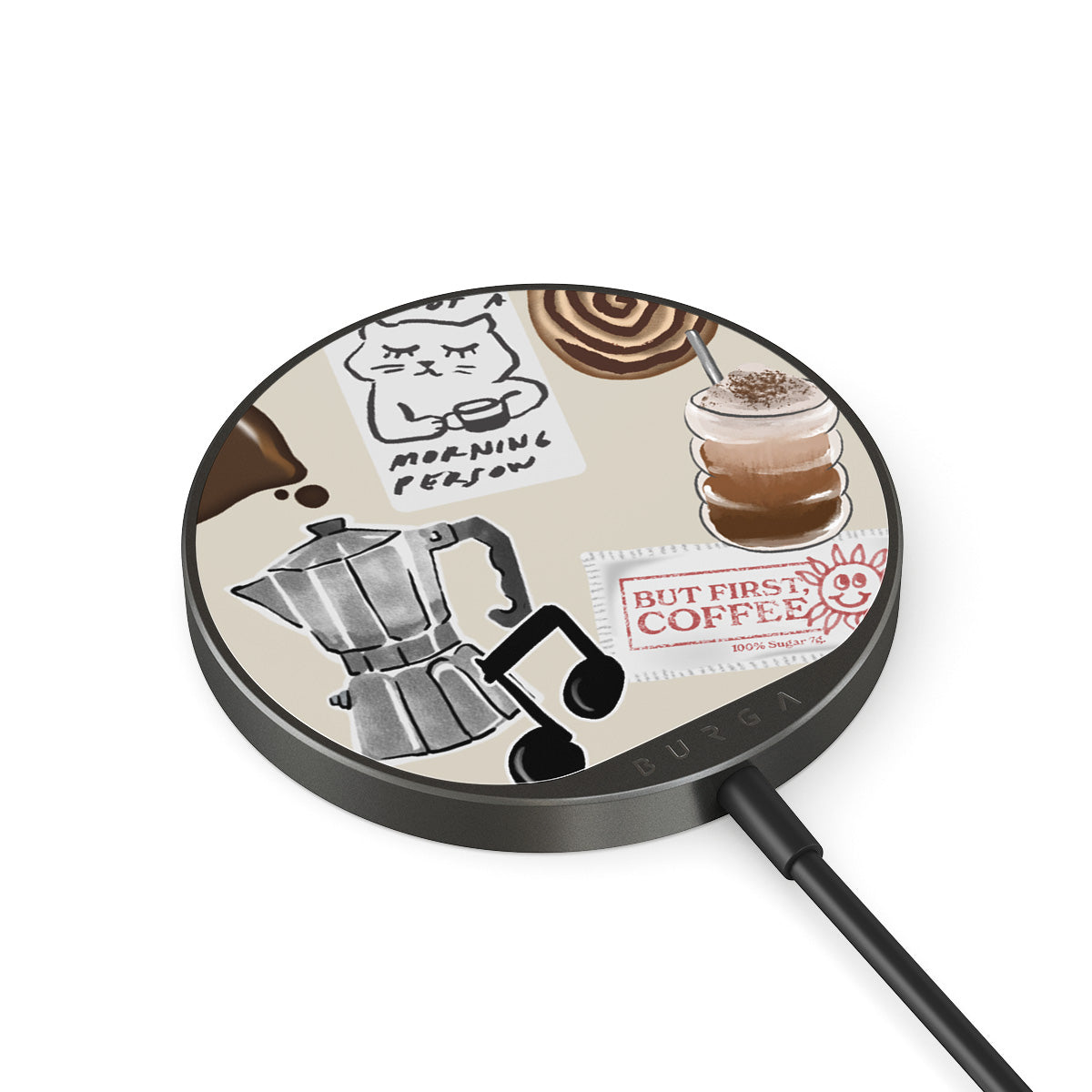 Kenmerken van dit design: mokkapot, frappé, kaneelbroodje, chocoladen hart, sticker "Not a morning person", bonnetje "But First, Coffee", muzieknoot