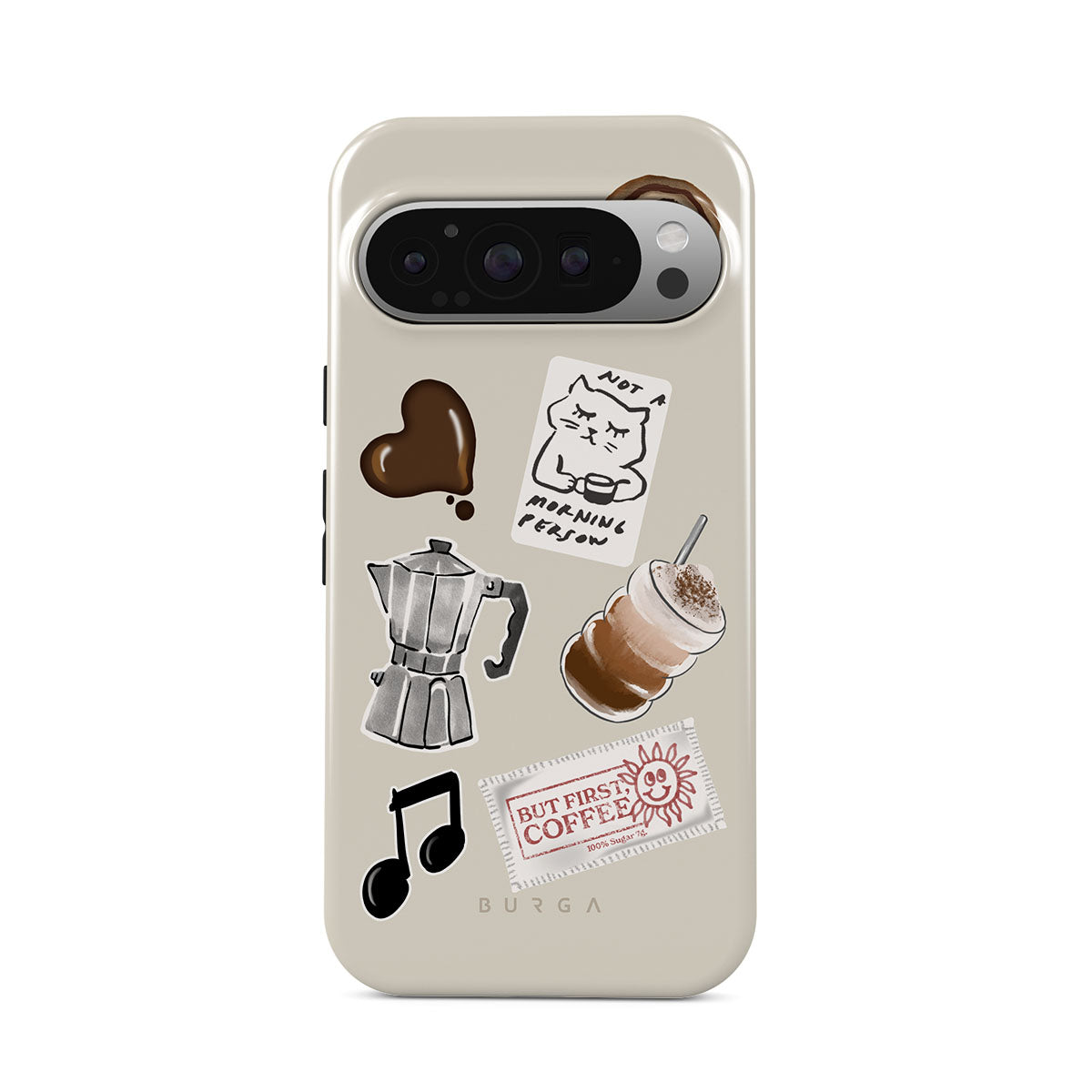 Kenmerken van dit design: mokkapot, frappé, kaneelbroodje, chocoladen hart, sticker "Not a morning person", bonnetje "But First, Coffee", muzieknoot.