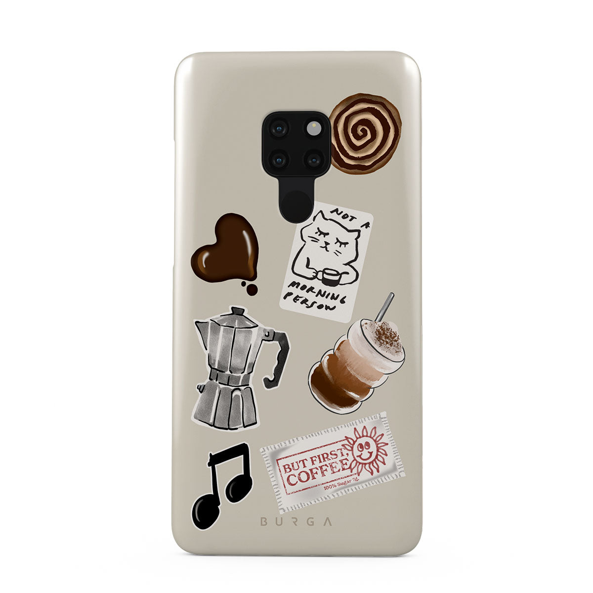 Kenmerken van dit design: mokkapot, frappé, kaneelbroodje, chocoladen hart, sticker "Not a morning person", bonnetje "But First, Coffee", muzieknoot.
