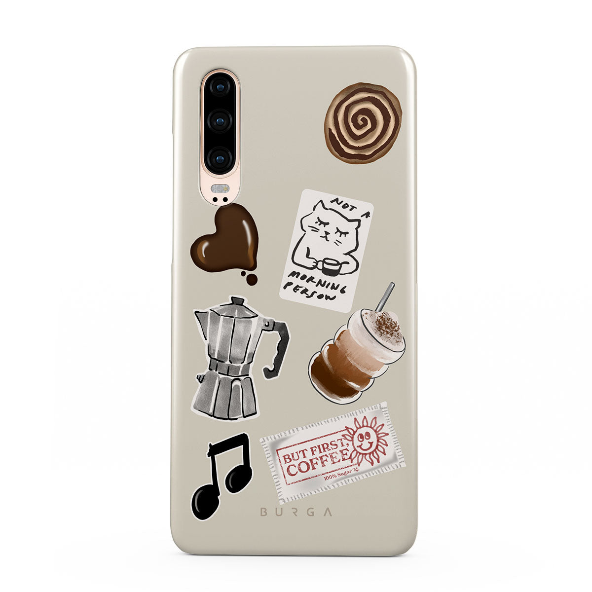 Kenmerken van dit design: mokkapot, frappé, kaneelbroodje, chocoladen hart, sticker "Not a morning person", bonnetje "But First, Coffee", muzieknoot.
